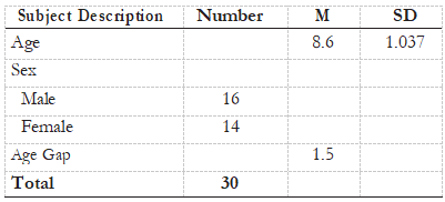 The sample for this research was students in grades 2, 3, and 4 who were included in the research subject criteria and were selected using stratified random sampling. The criteria determined are children aged 8-12 years or elementary school level, having sibling rivalry which was found through research scales, and having at least one sibling (either biological or cousin). The total research sample comprised 30 children (M age=8.6; SD age=1.037) with an average age gap between siblings of around 1 – 2 years (Table 2). Subjects involved in this research had obtained approval represented by their parents by filling out informed consent.