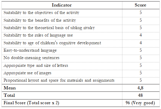 The research module and pocketbook were prepared to ensure uniformity in how to play during data collection and it was expected that children would still be able to play Benthikeven though the research was completed. The pocketbook was taken from modules that have been prepared, the difference lies in the design of the colorful pocketbook and several illustrations so it will attract children's interest and how to win the game which contains important values in Benthik. After going through the preparation stage, the module underwent expert validation, namely by a psychologist, to assess the fitness of the content and theory in the module (Table 3). Based on an assessment by a psychologist, The Benthikgame guide module received a final score of 96 in the very good category. Some suggestions and improvements were provided by psychologist said, in general the module has been structured systematically, but it is necessary to add the time allocation for each session on pages 6–7, so that the overall time allocation is clear and the content review is worthy of inclusion, however, with minor revisions.