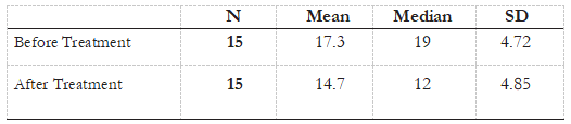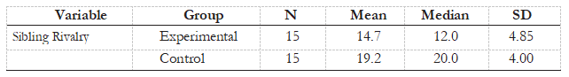 Based on the Kolmogorov-Smirnov measurement value, p> 0.05, so the data are normally distributed. Meanwhile, the results of the homogeneity test based on Levene's value found p> 0.05, therefore, there was no difference in variance in the sibling rivalry data between the experimental and control groups (homogeneous data). Meanwhile, the descriptive analysis revealed that the experimental group (M= 14.7; SD= 4.85) had a lower mean sibling rivalry after the treatment compared to the control group (M= 19.2; SD= 4.00) (see Table 4).