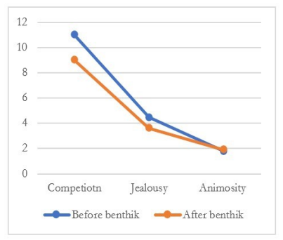 This graph indicates Benthikhad a significant decrease in the aspects of competition and jealousy, while the animosity feature did not show a significant decrease. This was then explored further by researchers through secondary data collection by interviewing students' parents. The explanation regarding the ineffectiveness of Benthik in overcoming hatred was due to inadequate experiences when playing with siblings, so the experience reappeared when playing.