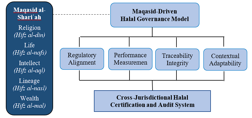 The rapid growth of the global halal industry demands an epistemological framework that is rooted in Islamic principles and aligned with international regulations. This study addresses three questions: (1) how Islamic epistemology can be systematically constructed through its ontological foundations and axiological orientations to form a coherent halal industry framework; (2) how Islamic epistemology informs public policy and ethical governance globally; and (3) what is the most effective model for integrating maqasid al-shari‘ah into cross-jurisdictional halal certification and audits. Using a qualitative conceptual research design based on integrative library research and doctrinal analysis of classical Islamic texts, contemporary maqasid literature, and international halal standards, this study develops a Maqasid-Driven Halal Governance Model (MDHGM). Within this framework, ontology clarifies the metaphysical assumptions underpinning halal norms, while axiology specifies the ethical objectives that guide epistemological reasoning and regulatory application. Findings show that embedding Islamic epistemology into regulatory practices enhances traceability, performance, and contextual adaptability. Harmonizing maqasid values with global regulations strengthens trust, interoperability, and sustainability in the halal industry. This study is limited by its conceptual and library-based design, which lacks empirical validation across diverse institutional and regulatory contexts. Future research should empirically test the proposed model across jurisdictions and industry sectors to assess its applicability and robustness.