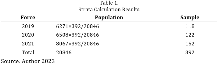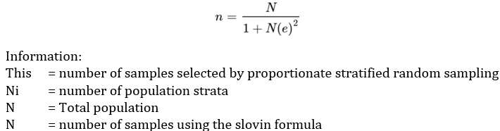 Based on the calculations above, if the value of n is rounded, are 392 samples used in this study. The number of respondents is considered to be representative of obtaining research data. Samples were taken using proportionate stratified random sampling shown in the formula in the following table: