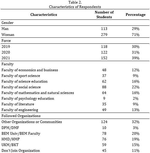 Table 2 shows that women dominated respondents with a total of 71% (n = 279 respondents). Meanwhile, men amounted to 29% (n = 113 respondents). Furthermore, based on class, respondents came from class 2019, namely 30% (n = 188 respondents), and class 2020 amounted to 31% (n = 122 respondents). Meanwhile, the 2021 class is 39% (n = 152 respondents). Thus, the batch of respondents is dominated by the class of 2021. Meanwhile, most of the faculties of the respondents are at the Faculty of Social Sciences, namely 22% (n = 88 respondents) and the rest are spread across various other faculties with a percentage below 17%. Meanwhile, most respondents had participated in organizations either on campus or off campus (89%), only 11% of the total respondents had not participated in organizations or other activities.
