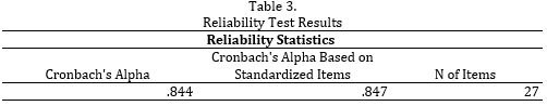 Based on the reliability test that has been carried out, the results show that the Cronbach's Alpha value is 0.844. This value is greater than the value of 0.60. Thus, the instrument in this study is said to be reliable. The Cronbach's Alpha value of 0.844 can also be interpreted that the instrument has a high level of reliability (Ghozali, 2018).