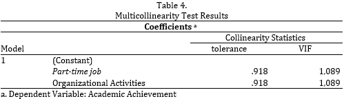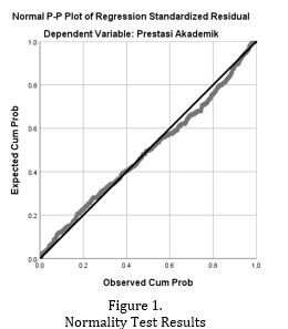 The coefficient of the finding variable equation is constant and positive at (19.508). Meanwhile, it is 0.279 (27%) for the part-time job variable and 0.056 (5.6%) for the organizational activities variable. Based on these findings, it can be said that every one unit increase in part-time job correlates with a 0.279 unit increase in academic achievement. The increase is influenced by their high motivation, not only to fulfill their needs, but also to complete their studies. Meanwhile, it shows that every one-unit increase in organizational activities correlates with a 0.056 unit increase in academic performance. The effect of the increase is caused by being able to think critically which is honed in the organization and then used in lectures. Thus, there is a positive relationship between the variables of part-time job, organizational activities, and academic performance.