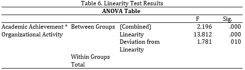 Linearity testing is carried out to see a linear and significant relationship between 2 or more variables. Linearity test is done by looking at the linearity value in the ANOVA table. The decision taken in this test is that if the sig value for linearity is less than 0.05, linearity occurs between variables (Ghozali, 2013). The test results can be seen in table 6.