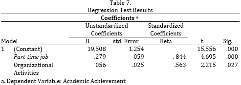 Based on Table 7 it is known that the sig value of the Part-time job variable is 0.000 and organizational activity is 0.027, which is less than 0.05. Thus, the effect of Part-time jobs and organizational activities on academic Achievement is partially significant. Therefore, it can be concluded that H1 (there is a positive and significant influence between Part-time jobs on the academic Achievement of Malang State University students) and H2 is accepted (there is a positive and significant influence between organizational activities on the academic Achievement of Malang State University students).
