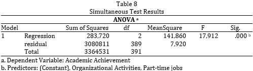 Table 8 shows that the sig value is 0.000 which is smaller than 0.05. Therefore, H3 (there is a positive and significant influence between Part-time jobs and also organizational activities on the academic Achievement of Malang State University students.) is acceptable, meaning that there is a positive and significant relationship between part-time job and organizational activities with academic Achievement.