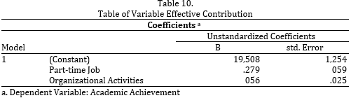 Table 10 shows that Part-time jobs get a value of 5.9% and organizational activities of 2.5%. It is concluded that the variable X1 (part-time job) has an effect of 5.9% on academic Achievement and shows that part-time job has the most significant effect. Meanwhile X2 (organizational activity) has an influence of 2.5% on academic Achievement and makes a small contribution. Thus, if the total effective contribution of the variables is totaled, it will be in accordance with the test results of the coefficient of determination of 8.4%.