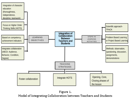 Table 1 shows how the developed learning implementation plan integrates collaboration between teachers and students. This integration can be found in the learning objectives, teaching strategies, and the learning activities, which include introduction activities, core activities, and closure activities.