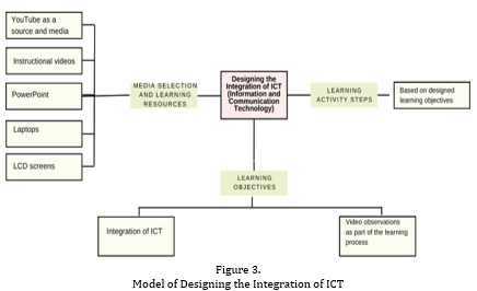 Figure 3 shows that the integration of Information and Communication Technology (ICT) into the lesson plan represents a significant advancement in modern education, acknowledging the transformative potential of digital tools. This comprehensive approach comprises various key components, including learning objectives, learning activitiess, media selection, and learning resources. In terms of learning objectives, the model highlights the incorporation of video observations as an integral part of the learning process. This emphasizes the role of visual content and multimedia in enhancing the learning experience, which is in accord with the contemporary digital learning trends [16].