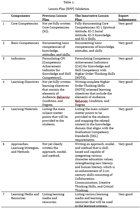 Hence, it is imperative for teachers to construct comprehensive Lesson Plans (RPP). As previously elucidated, the educational process must impart not only knowledge but also cultivate essential 21st-century skills in students [3]. Therefore, the RPP that educators create should intricately depict the integration of these critical skills within each step of the teaching and learning process. This strategic approach serves a dual purpose. Firstly, it equips students with the skills and competencies they need to thrive in the future, particularly within the context of the Fourth Industrial Revolution. Secondly, it fosters an active and meaningful learning environment, empowering students to become well-rounded individuals capable of competing in an increasingly dynamic and technologically-driven era. The creation of these skill-centered RPPs is pivotal in shaping the educational landscape and ensuring that students are well-prepared for the challenges of the 21st-century [7] [4].