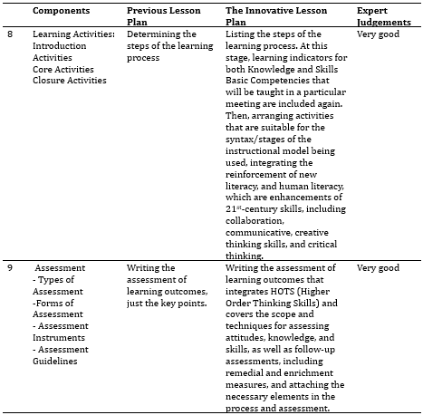 Figure 2 indicates that the integration of Higher Order Thinking Skills (HOTS) into the Lesson Plan (RPP) represents a crucial development in contemporary educational practices. This comprehensive approach considers several key components, including competency achievement indicators (IPK), learning objectives, learning activities, and assessment. In the context of IPK, the model demonstrates a shift towards precision and clarity by incorporating operational verbs into the competency achievement indicators, aligning with the principles of effective goal setting. This transition from vague indicators to more specific and actionable terms enhance the effectiveness of the learning process.