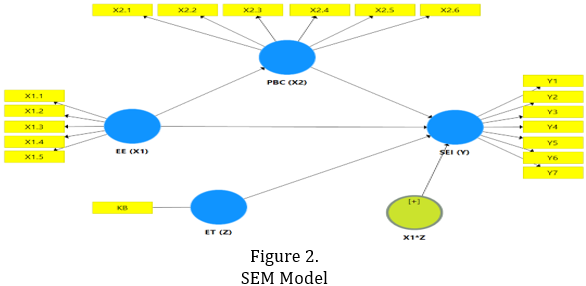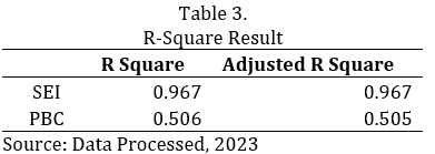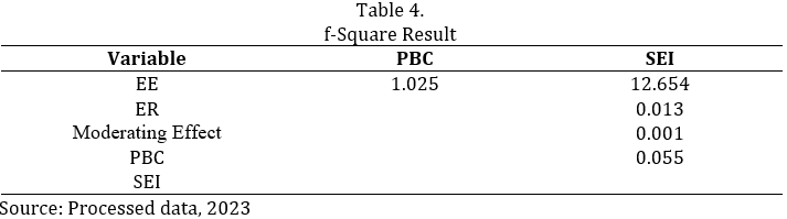 Based on the calculation results, it can be concluded that the Entrepreneurship Education variable has an f-square value of 12.654, indicating a strong influence on social entrepreneurship intention. The Entrepreneurial Tendency variable has an f-square value of 0.013, indicating a weak influence on social entrepreneurial intentions. The Moderation variable has an f-square value of 0.001, signifying a very weak influence on social entrepreneurship intention. Lastly, the Perceived Behavioral Control variable has an f-square value of 0.055, indicating a moderate influence on social entrepreneurship intention.