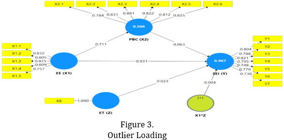 Subsequently, the validity and reliability tests were carried out to determine whether the variables used in the research were valid and reliable. Variable measurement indicators can be qualified if they have a loading factor value > 0.70 (Henseler et al. 2009). The results after testing outlier loadings on 19 indicators show that each indicator has met the requirements. The following is a picture of the outlier loading results: