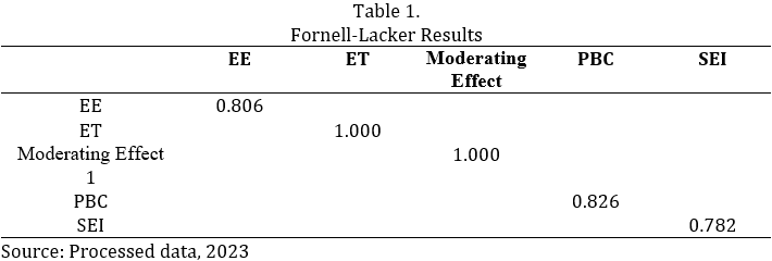 Based on the results obtained through SmartPLS calculations, it was determined that all indicators for each variable in terms of convergent validity achieved a loading factor value > 0.70, thereby confirming the validity of all 19 indicators. Moreover, concerning discriminant validity, the findings reveal that each variable exhibits a Composite Cross Loading value > 0.70, as depicted in the Fornell-Larcker Results table below: