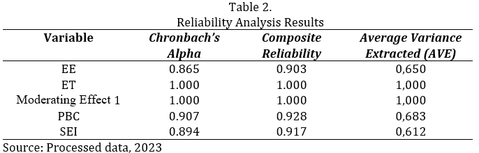 Subsequently, the reliability test results indicated that each variable had a Composite Reliability Value > 0.70, signifying the construct's ability to demonstrate the accuracy, consistency, and precision of the instrument. The AVE value for the Entrepreneurship Education variable (X1) was 0.903, underscoring its substantial contribution to explaining variations in social entrepreneurship intention. Similarly, the Perceived Behavioral Control variable (X2) exhibited an AVE value of 0.928, emphasizing its significant contribution to the understanding of variations in social entrepreneurship intention. The Social Entrepreneurship Intention variable (Y) obtained an AVE value of 0.917, indicating that this variable had a significant contribution in explaining variations in social entrepreneurship intention. The moderator variable obtained a value of 1.000, suggesting that this variable had no contribution in explaining variations in social entrepreneurship intention but served as a regulator in the relationship between the independent and dependent variables. Therefore, it was concluded that the regression model used in this research had good accuracy, consistency, and instrument precision in explaining variations in social entrepreneurial intention.