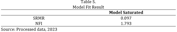 In Goodness-of-Fit (GoF) testing, the accuracy of the overall structural model validation process is measured and determined. Based on the GOF test, an SRMR value <0.10 or 0.08 (Lihat Hu and Bentler, 1999) is considered in accordance with the research results. The Normal Fit Index (NFI) produces a value between 0 and 1, and the closer it is to 1, the better the model is built.