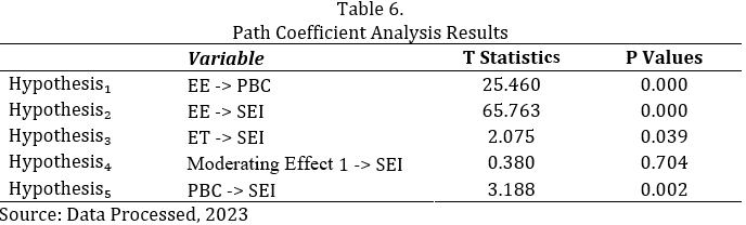 Hypothesis testing refers to the T-Statistic value and P-value. If the T-Statistic value > 1.96 or P-value < 0.05, it is concluded that Ha is accepted. The following is table 6 of the path coefficient test results: