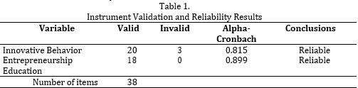 Based on the validity test that has been carried out with the SPSS innovative variable above, it can be seen that the 23 questionnaire items that have been tested the results are 20 valid questions> 0.30 while 3 items are invalid because the results show <0.30 and for the entrepreneurship education variable all questions used are valid. Meanwhile, the results of the instrument reliability test or test with Alpha-Cronbach obtained values between 0.815 – 1.000 > 0.600, so it can be concluded that all questions in this study are reliable or consistent because the alpha value > r table value.