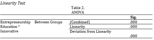 The table above shows that the results of linearity testing obtained the significance value of entrepreneurial education to innovative 0.00 <0.05 means that the relationship of independent variables with the dependent variable is linear.