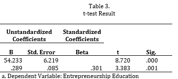The table above shows that the results of the t test obtained a tcount value of 3,383 > a t-table value of 1,980 meaning that the H1 hypothesis is accepted: Variable (X) entrepreneurship education on innovative (Y) variable has a positive influence, so hypothesis H0 is rejected.