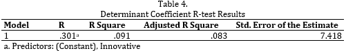 The calculated r value is 0.301. means that the entrepreneurship education variable (X) has an effect on increasing innovative behavior (Y) by 30% The remaining 70% is influenced by other variables both internally and externally based on research journals found a, such as: creativity, motivation, self-efficacy, and desire to succeed based on previous research journals.