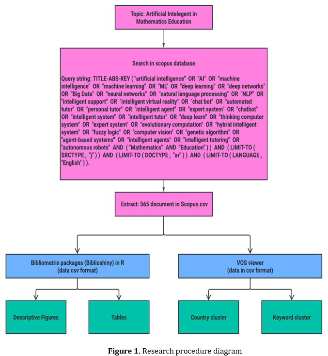 A bibliometric analysis utilizing the Scopus database is used in this study. Bibliometric analysis is a type of content analysis that uses visual maps to show how an author, publication, or author who has been referenced is related to other publications and authors (Zupic & Čater, 2014). The author's keywords, title keywords, and other keywords together with the bibliometric analysis would be used to categorize any prospective research trends or research gaps (Chen et al., 2016). The analysis focused exclusively on research papers on the topic artificial intelligence in mathematics education. The selection of our source was based on Scopus journal database and by using Scopus advanced search query and filtering options to reach relevant study. Then we conducted a comprehensive analysis of bibliographic data gathered using the Biblioshiny for Bibliometrix package in R software (Aria & Cuccurullo, 2017) and VOS viewer (van Eck & Waltman, 2010)