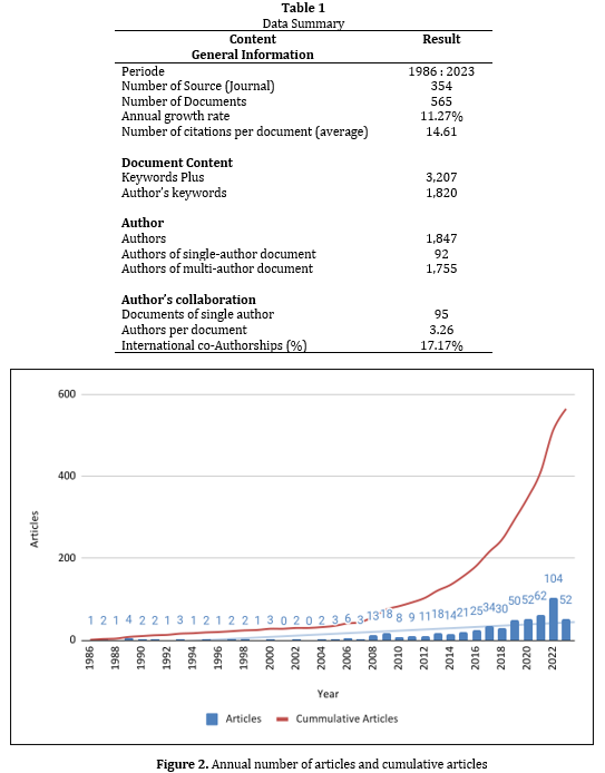 There were 1.847 authors that produced those 565 articles from 354 journals with 11.27% annual growth rate, however, the growth rate is uneven between the years and 14.61 average citation per document. In addition, it is seen that an average of 3.26 authors contributed to the production of each article and the international collaboration index in the field is determined as 17.17%.