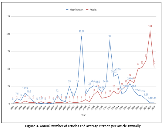Figure3 displays the influence of research conducted over a certain year (i.e., citations). The average number of citations to studies across all studies included in the Scopus database is displayed by the bibliometric metric known as the Mean Total Citation per Articles (MTCA). Both the quantity of articles and the MCTA have seen an upward trend since 2000.