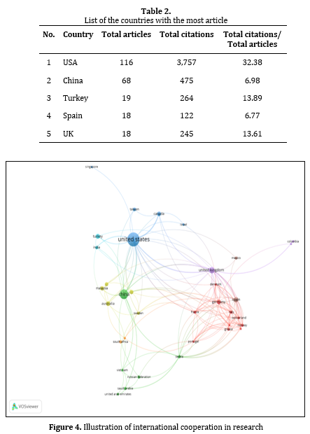 Data from Scopus show that writers from 71 different nations and regions took part in the study of this subject. Table 2 provides information on the top 5 publishing nations. The USA is the nation that provides the most papers in this subject, with 116 published articles (20.53 percent of all publications), 3.757 citations (53.69 percent of all citations), and an average article citation of 32.38. Second on this list is China with 68 published articles (12.04%) with 475 citations (6.79%) and average article citation is 6.98. Other countries Turkey (3), Spain (4), UK (5), on the other hand Indonesia in 29th position produces 3 articles (0.53%) with 32 citations (0.46%) but the average article citation is 9. The authors from the 37 nations represented in Figure 4 have worked with the other nations. The USA, UK, China, and Germany are among the nations that collaborate the most. Although it has been noted, there is often little scientific cooperation in this field. Although there is no cross-border study cooperation, Malaysia and Singapore are the two Southeast Asian countries with the most publications on this topic.