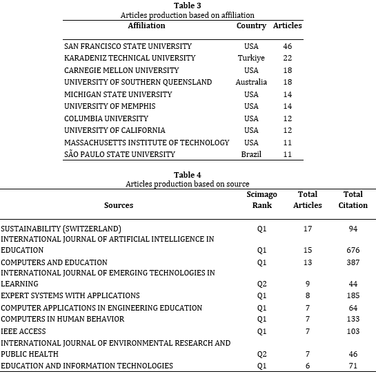 Figure 5 shows the most relevant institutions that publish articles on Artificial intelligence in mathematics education. The top ten institutions are mostly in the USA. They are San Francisco State University with 46 articles, Carnegie Mellon University with 18 articles, Michigan State University and University of Memphis with 14 articles, Columbia University and University of California with 12 articles and Massachusetts Institute of Technology with 11 articles. The other top relevant institutions outside the United State are Karadeniz Technical University in Turkiye with 22 articles, University of Southern Queensland in Australia with 18 and Sao Paulo State University in Brazil with 11 articles.
