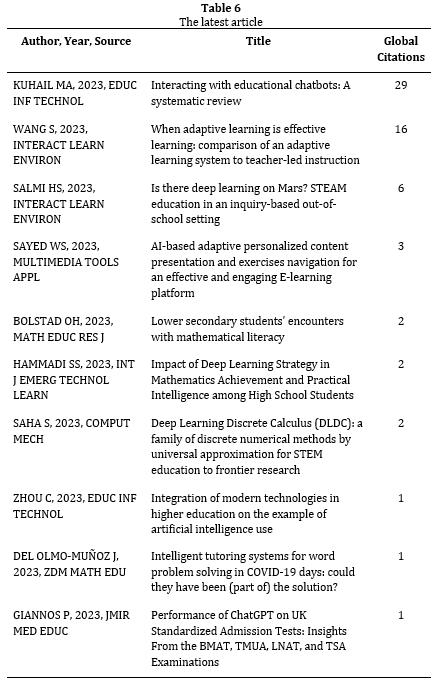 Table6 displays the top ten papers from 2023 with the greatest number of references to research on artificial intelligence in mathematics education. A systematic review of chatbot deployment in education across seven dimensions, including the educational field, platform, design principles, the role of chatbots, interaction styles, evidence, and constraints, is the most cited paper (29 global citations were found) and was written by Kuhail et al. (2023) in the journal Education and Information Technologies. The second position in terms of global citation (16) is about the effectiveness of adaptive learning that personalizes instruction to students’ individual learning needs and abilities compared to teacher-led instruction(Wang et al., 2023). The publication regarding deep learning in STEAM education outside of school is now ranked third (6). The STEAM intervention appears to have resulted in long-term learning, and the exhibition learning environment has been demonstrated to offer a suitable platform for reaching the deeper layers necessary for successful knowledge retention (Salmi et al., 2023). Some other topics that are also of interest to researchers this year are AI-based adaptive personalized content (Sayed et al., 2023), deep learning in calculus (Saha et al., 2023) and high school (Hammadi et al., 2023), intelligent tutoring system (del Olmo-Muñoz et al., 2023) and ChatGPT performance in standardized tests (Giannos & Delardas, 2023).