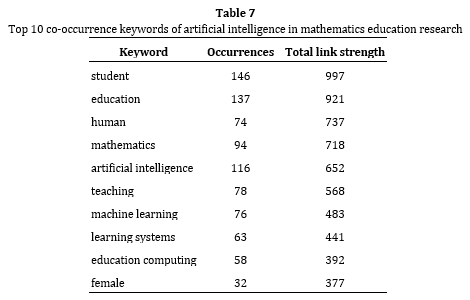 We then analyze keywords co-occurrence that was recorded using VOSviewer. The term "occurrences" denotes a link between two terms. Each link has a strength, which is denoted by a positive number value in the VOSviewer documentation. The stronger the relationship, the higher this number. The overall link strength shows how many publications contain two keywords that are used together. Table7 shows 10 keywords with highest total link strength, based on this result, it can be found that the trends on artificial intelligence in mathematics education research are related with those keywords. It can be noted that student is the most frequently appearing keyword and has the highest total link strength, with 146 and 997, respectively. It is obvious that the main keyword on artificial intelligence in mathematics education study is student. The second order is Education, with 137 occurrences and a total link strength of 921. Human, Mathematics, Artificial Intelligence, Teaching, Machine Learning, Learning Systems, Education Computing, and Female were the following categories.
