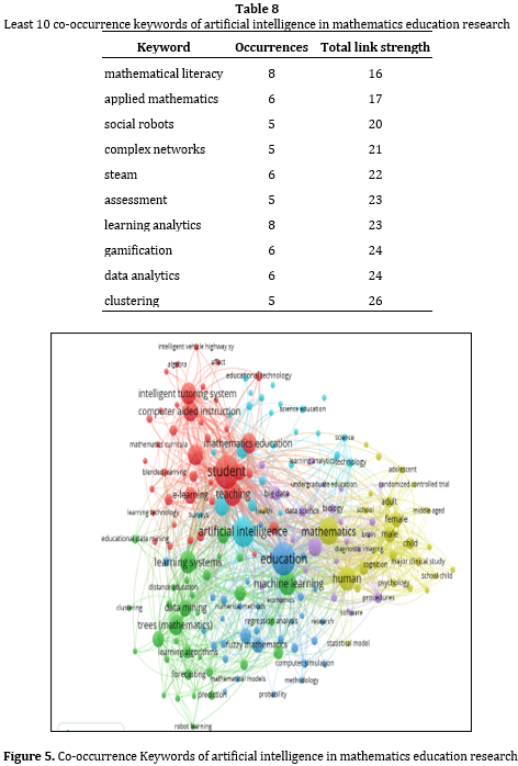 On the other hand Table8 shows 10 keywords with lowest total link strength, based on this result, it can be found that those keywords are rarely used on artificial intelligence in mathematics education research. Researchers can use the information about the lowest total link strength to identify potential research gaps and areas for further exploration. Mathematical literacy was a keyword that was rarely used, only 8 occurrences, and also rarely occurred with other keywords (total link strength = 16) on artificial intelligence in mathematics education research.