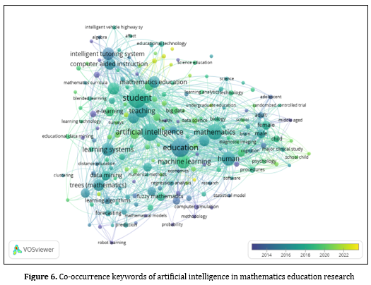 The first cluster (in red) consists of 34 keywords, when viewed from the circle size in this first cluster, three keywords with the largest diameter are such as “education”, “learning”, and “fuzzy logic”. The second cluster (in green) consists of 34 keywords such as “machine learning”, “learning system”, and “data mining” are the three largest circles in the cluster. The third cluster (in blue) consists of 34 keywords such as “student”, “teaching”, and “intelligent tutoring system” are the three largest circles in the cluster. The fourth cluster (in yellow) consists of 30 keywords and three keywords with the largest diameter are “artificial intelligence”, “engineering education”, and “e-learning”. The fifth cluster (in purple) consists of 26 keywords with “mathematics”, “human", and “female” being the three largest circles in the cluster. Other clusters have more minor keyword occurrence and research focus. Figure6 shows that the center of the map is where students, education, artificial intelligence, mathematics, teaching, and machine learning are all concentrated. These terms are ideas that have been researched in conjunction with other clusters and were found to be the most popular keywords.
