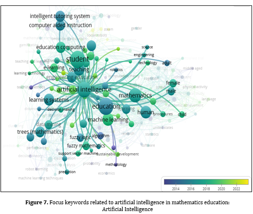 Figure 7 displays several instances of results from a keyword mapping with a more focused subject matter, such as artificial intelligence. Figure 7 shows co-occurrence between artificial intelligence and other keywords that are already related. For example, if a researcher wants to study the trend aspect of artificial intelligence, they can focus on keywords with the largest diameter and connected to artificial intelligence’s nodes such as: education, teaching, student, mathematics, and learning system. If a researcher wishes to study more specialized topics, they can concentrate on terms associated to artificial intelligence's nodes that have the lowest diameter, such as "intelligent tutoring system," "computer aided instruction," and "teaching methods". If a researcher wants to research a relatively new aspect, they can focus on keywords that not-connected to artificial intelligence’s nodes such as: mathematical literacy, mathematics curricula, STEAM, and gender.