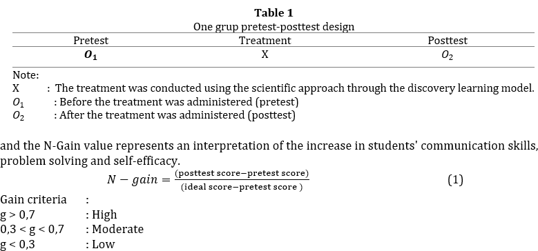This research is a quantitative research, and the type of research applied in this research is quasi-experiment [?]). The research design used is a one-group pretest-posttest design, aimed at determining the students' competence in mathematics learning on the topic of trigonometric ratios. A one-group pretest-posttest design is used to evaluate the effectiveness of implementing a program [?]2019 [?]2016. The implementation of this research was carried out by [?]2016 in evaluating the influence of stigma on schools in Canada. Before the implementation of the learning process, the students were first given a pretest to assess their initial competence. After the learning process, the students were given a posttest to assess their competence after the implementation of the learning process using the scientific approach with the discovery learning model, which supports communication, problem-solving, and self-efficacy skills. This research was conducted in 10th-grade at SMAN 4 Wira Bangsa Aceh Barat, with a population of 29 students. Based on the presented research design, as shown in Table 1.