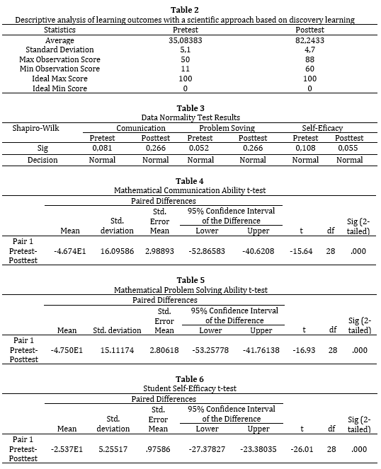 Based on data from research conducted using a scientific learning approach with a discovery learning model on mathematical communication skills, problem solving abilities and self-efficacy, explained in the following discussion.
