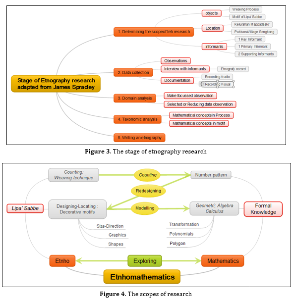 Specific intelligence is explored in the form of creative thinking processes, manufacturing techniques and mathematical practices by craftsmen in the activity of weaving silk sarongs or lipa’ sabbe. Data is collected through observations, interviews, and documentation. The instruments used were observation sheets and interview guides. Before the research was carried out, the instruments to be used were validated first. The observation sheet focuses on mathematical activities that are implemented in the weaving process directly. While the interview guidelines are categorized into 2 main aspects, namely primary aspects and secondary aspects. The primary aspect is related to ethnomathematics. In this primary aspect, the researcher wants to know whether there is a theoretical understanding of the elements of geometry, and the techniques used in the process of depicting silk motifs. While the secondary aspects include the identity of the weavers, history of weaving activities, aspects of understanding motifs including the names of motifs, considerations in selecting motifs, aspects of tools, materials and processes, and techniques in designing motifs. Validation was carried out by experts and experienced in the field of ethnomathematics. The data obtained is used in further in-depth study of the activities and mathematical concepts involved in the manufacturing process and the motives of lipa’ sabbe. The first stage of this procedure includes determining the scope of the research. In this stage, the objects, locations and informants are determined. The main object of this research is the technique of making silk sarongs and the motifs produced from the weaving process by craftsmen. In order to obtain efficient and effective research results, in this study, a regional boundary was determined, namely the Tanasitolo sub-district in Mappadaelo' Village and Pakkana Village, with the consideration that these two areas are known as the center of silk craftsmen in Sengkang. Furthermore, four informants were determined, each of which was the main informant, key informant, and two supporting informants. The four informants were selected through consideration of their direct role as the main actors, in this case as craftsmen who had understood and were directly involved in the manufacture of lipa’ sabbe. The next stage is data collection, which includes interviews with informants, recording the results of interviews, recording or documentation. Data was collected in October 2021, consisting of four visits to the research site. Furthermore, triangulation was carried out to ensure the validity of the data. Triangulation involves verification and validation of qualitative data analysis (Nurani, 2008). The triangulation carried out in this study was source triangulation. Researchers confirmed the data that had been obtained from one informant to another. In this study, there were four informants who were interviewed regarding the technique of making lipa’ sabbe. Furthermore, to ensure data reliability, two methods were carried out, by extending the observation process and conducting an interview process until data or information was found that had not changed. Reliability is often defined as the consistency and stability of data or findings (Stainback & Stainback, 1988). From interviews with the four informants, data were obtained in the form of consistent interview results so that the researcher concluded that the data had reached a saturation point. Thus, it can be said that the data is reliable. The next step is to conduct a domain analysis, which is intended to build a correlation between the research objectives and the data obtained. Thus, at this stage, data reduction is carried out by selecting certain interview notes and the required documentation. The domain analysis is followed by a series of taxonomic analyses. In ethnomathematics research, taxonomic analysis is aimed at matching up mathematical concepts in formal education, to the observed cultural elements. Specifically, the cultural elements that are focused on in this research are the lipa’ sabbe weaving process and the resulting geometric patterns. While the mathematical studies that are prioritized in taxonomic analysis include exploration of the integration of number patterns and the symmetry of geometric fields, geometric transformations, modeling of algebraic functions, and some calculus concepts on silk ornaments. From the whole procedure above, it is closed by writing an ethnography. In summary, the object, location, and stages of this research described above can be presented through the Figure 3. The ethnomathematical exploration in this study combines mathematical activities by a group of craftsmen with mathematical concepts in formal education as illustrated in the Figure 4.