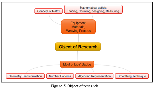 Number patterns in formal mathematics learning can be found on the topic of sequences and series. In a simple concept, a sequence can be understood as a regular arrangement of real numbers with a certain pattern. Thus, the sequence in real analysis is defined as a function that maps natural numbers to the set of real numbers. Changes in numbers from one term, to the next term, are determined by certain patterns. Commonly, the types of sequences include arithmetic sequences, multiple sequences, geometric sequences and Fibonacci sequences. However, number patterns in a more general view are often associated with a person's ability to read patterns through addition, subtraction, multiplication techniques on certain number sequences. Furthermore, number patterns are usually still used as topics in general intelligence instruments. In making the lipa’ sabbe motif, it is different in the process of making the motif on batik, the lipa’ sabbe weaver applies counting techniques. In designing patterns or motifs on batik, it is still known as batik, which is the process of drawing on cloth that combines elements of points, polylines and polygons. Meanwhile, in designing the motif on lipa’ sabbe, the depiction of the motif can be done through the usual weaving technique or known as the tette' technique, another technique is the sobbi' technique. Identification of number patterns on cultural objects can be found in several previous studies. Number patterns in the traditional game "Nasi Goreng Kecap" which is integrated in learning (Rosikhoh et al., 2020). In particular, the pattern of numbers on batik motifs has also been investigated. The results of the study indicate that in Adipurwo batik motifs, different arithmetic patterns can be found in the types of geblek and clanting motifs, bitter melon leaf motifs and clorot (Astuti et al., 2019). The different thing in this study, the number pattern is modeled based on the position of the motif thread against the basic thread. According to the results of the interview, the placement of the motif thread against the basic thread requires calculation, so that the resulting motif is balanced and proportional to the combination of other motifs.
