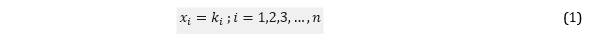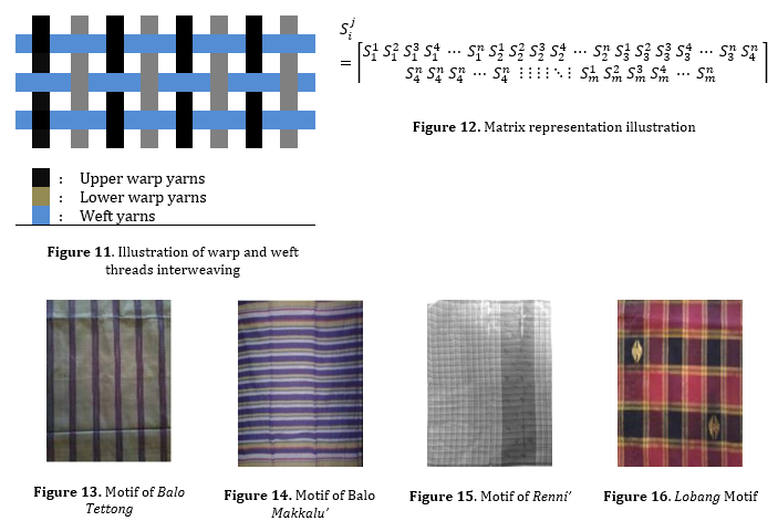 The perpendicular position of the warp and weft yarns results in a very tight arrangement of rows and columns. Mathematically, the interlacement of the warp and weft yarns is in accordance with the matrix concept. In the matrix, the warp yarn used can be denoted by index for warp the top, while the lower warp is denoted by index . Moreover, the arrangement of the weft strands inserted midway between the upper and lower warp threads can be denoted by the index : . Perpendicularly, the interlacement between the warp (vertical) and weft (horizontal) yarns result an arrangement of rows and columns which can be denoted by . These warp yarn indices are used by craftsmen to mark through the fitte technique. Through certain counting activities, the weaver gives a sign where the weft yarn begins to be inserted or pulled out. Based on the results of the interview, the informant explained that the location markers of the warp threads are very helpful for weavers in designing motifs. The illustrations of warp and weft threads interweaving and the matrix representation can be seen in Figure 11 and 12 respectively