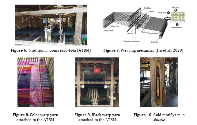 In converting silk threads into silk cloth, craftsmen use two types of traditional looms, namely the gedogan loom or known as walidah and the other type is traditional ATBM, the Non-Machine Loom Tool or known as the bola-bola as shown in Figure 6. As for the ATBM, it is composed of several elements that have different functions including: pessa, pedal, wakkangeeng, taropong, awereng, boko-boko, suru’, jakka, pabbiccang are’, tali-tali penenada, bum, dinamo, Jencara. The parts of the ATBM above are constructed in such a way as to resemble a vehicle, for craftsmen in Sengkang call it with Bola-bola which means an artificial house. The construction of the balls or ATBM in Sengkang is the same as the construction of the weaving mechanism which is illustrated in the book Fundamentals of Fibrous Materials (Hu et al., 2020) as shown in Figure 7. Furthermore, the basic materials used include warp threads, weft threads and motif threads in various colors and sizes. The warp thread is the silk thread which is the basic thread in the weaving process. In ATBM, the warp threads are attached to the gun and the combs are stretched out in front of the craftsman. The warp threads are moved up and down by the craftsmen by moving the pedals up and down. Simultaneously with the up and down movement of the thread following the pedal movement, the weft or motif thread will be clamped tightly and evenly between the warp threads perpendicularly. In the process, the weft is inserted into the warp threads which are carried by a cylindrical coil container known as taropong (shuttle).