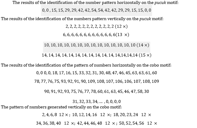 The tekte' technique is applied by setting the pakkarekeng and pabbicang are' at a certain position as a marker for the weft yarn limit for the motif to be inserted into the warp yarn. If the marker is lifted, then at this index the shuttle containing the motif thread is inserted into the open warp mouth. Next, the basic weft thread in the shuttle that moves back and forth is re-tightened by using the jakka as the tread or foot-pedal moves on the ATBM. The use of ma’tette technique can be seen in Figure 22. In this process, the motif is obtained by combining the colors of the warp yarns, the basic weft yarns and the motif yarns that are coiled in the shuttle. The provision of color position boundaries has various lengths according to the pattern desired by the weaver. As in making the balo pucuk of bamboo shoots motif, combining the colors of gold viscose threads with warp threads that are inserted directly by hand. In order for the motif to be balanced and symmetrical, it is necessary to establish a long tier pattern. Figure 23 and 24 are the results of the identification of the number pattern generated on the pucuk motif and the cobok motif. In designing each motif, it maintains horizontal symmetry, resulting in a certain number pattern.