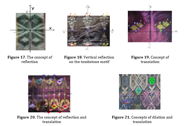 Transformation geometry is one part of geometry which refers to changes in the location, size, direction of geometric objects such as points, polylines or polygons. The operations used in transformation geometry consist of mirroring (reflection),shifting (translation), resizing (dilation), rotation (Prahmana & D’Ambrosio, 2020). Several previous studies have explored the concept of geometric transformation in various cultural attributes, such as batik ornaments, traditional houses, or in bamboo handicrafts (Maryati & Prahmana, 2019). In research by Anggraeni et al (2018) revealed that the Surakarta batik pattern can be found the application of the concepts of reflection, translation, rotation and dilation. Disclosure of meaning and implementation of geometric transformation on batik motifs such as Baboon Angreem, Parang Barong, Sidomukti, Sidoluhur, Soblog and Sidowirasat can be used as learning resources (Prahmana & D’Ambrosio, 2020). In addition, the concepts of reflection, translation, dilation, rotation and tessellation have also been explored in Solo batik (Faiziyah et al., 2021) dan Trusmi Cirebon (Karimah et al., 2013). In this study, the concepts of transformation geometry were also found in the observed lipa’ sabbe motifs as shown in Figure 17, 18, 19, 20, and 21. The existence of a motif that contains the concept of geometric transformation, shows an intelligence and special ability possessed by lipa 'sabbe weavers. In this case, the ability to place color, change size, change direction, change shape and maintain symmetry produces a variety of decorations on lipa’ sabbe.
