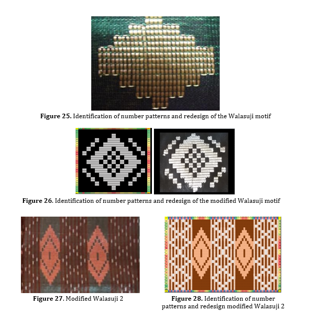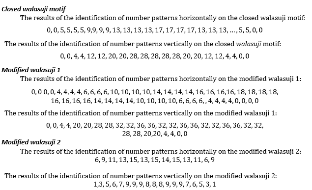 Identification of number patterns is carried out using the help of Ms.office excel to count the number of threads that arise in each motif. There are three types of walasuji motifs obtained in this research. The identification of number pattern and redesign of each motif can be seen in Figure 25, 26, 27, and 28, respectively.