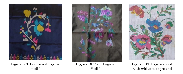 In this section, some lagosi motifs are visualized as flowers as shown in Figure 29, 30, and 31 . Geometrically, it can be said that the lagosi motifs in various colors are asymmetrical. Based on the results of the interview, the informant said that the lagosi flower motif is more difficult to design. The appearances that appear are generally in the form of flower stalks with branches, added with leaves and flower buds in various colors. The stalks look curved designed from a collection of yarn arrangements that are thicker than the base of the fabric. The thickness affects the texture of the silk fabric motif. The curvature of the stems and polygons of flowers and leaves is produced by the arrangement of the lengths of the rectangular yarns arranged in such a way that the ends look like they are curved.Based on the concept of calculus, this technique can be found in the technique of calculating the area of a curved area which is approximated by the area of a rectangle. As introduced more than 2000 years ago by Archimedes (Varberg et al., 2006). In the lagosi silk motif, rectangular shapes are arranged and form polygons with curved borders. This shows the skill and intelligence of silk craftsmen in making lagosi motifs from a collection of rectangular segments into curved areas that represent stalks, leaves and flowers.