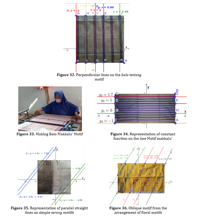 The next motif is the makkalu' motif, according to the results of interviews and direct observations, the makkalu' motif is obtained from a firm color compaction on the type of warp thread which is stretched towards the front of the craftsman. Thus, the resulting motif is only a line parallel to the top and bottom sides of the sarong. Figure 33 illustrates the process of making the motif. Meanwhile, the makkalu' motif in a mathematical perspective can be seen as a collection of horizontal lines parallel to the slope value of 0. In particular, in algebraic studies, these lines can be viewed as a collection of constant functions.