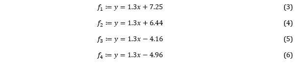 Several other motifs can also be represented by linear equation models. This model can be found in the serong motif. Based on the results of the interview, it was explained that the serong motif resulted from the counting and positioning accurately by considering the angle, length, slope, balance and alignment of the two lines. However, the alignment of the lines formed by the craftsmen does not consider the aspect of its algebraic representation. The craftsman revealed that the serong motif can be in the form of a collection of yarn positions that form a parallelogram through the sobbi' process and serong motifs resulting from the placement of ornaments that are made obliquely and parallel to each other's motifs. In this section, serong motifs are presented in a Cartesian coordinate system. In addition to simple serong motifs, there are also serong motifs composed of floral motifs as shown in Figure 35. These motifs form a linear line that is parallel to the other flower arrangements as shown in Figure 36. In simple Serong motif, 4 parallel lines can be produced which are made on 2 separate serong motifs, each with an equation that can be written as: