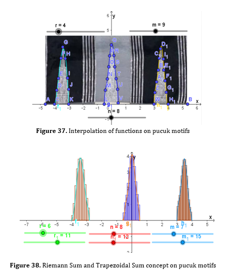 The concept of Riemann sum as a concept in approximating area by using rectangular segments that resemble pucuk motifs. While the use of a trapezoid sum produces trapezoidal segments that resemble the cobo’ motif.